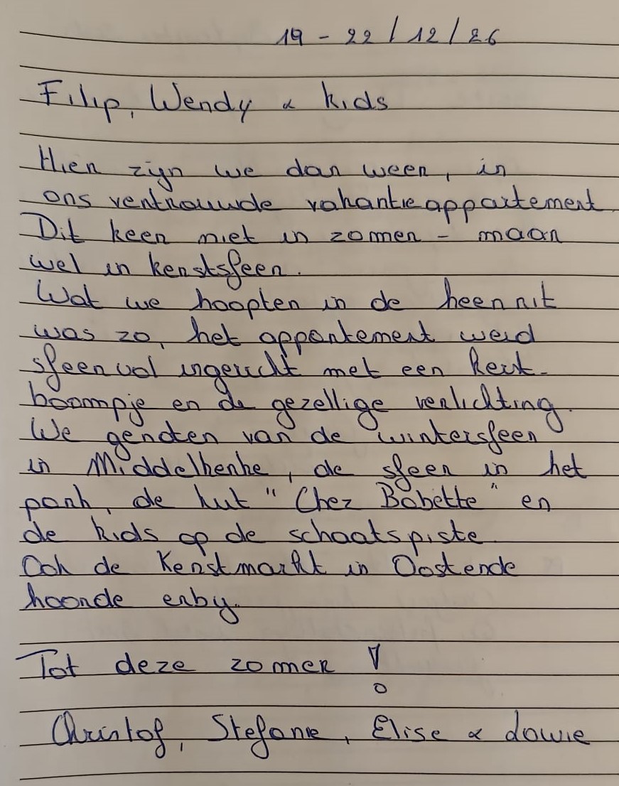 Wij kijken allemaal met een glimlach terug op onze heerlijke week vakantie in Middelkerke. Het weer was ons goedgezind, we genoten van de rust en de zee. Zoals altijd voelden we ons meteen terug thuis in jullie appartement. Met zoveel mooie herinneringen op zak kijken we nu al uit om volgend jaar terug te komen!