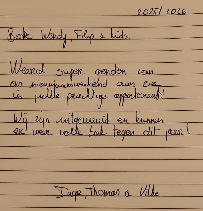 Wat hebben wij genoeten van jullie prachtige appartement. We voelden ons helemaal thuis. We konden het jaar niet beter afsluiten en starten met het nieuwe! We komen zeker terug!
